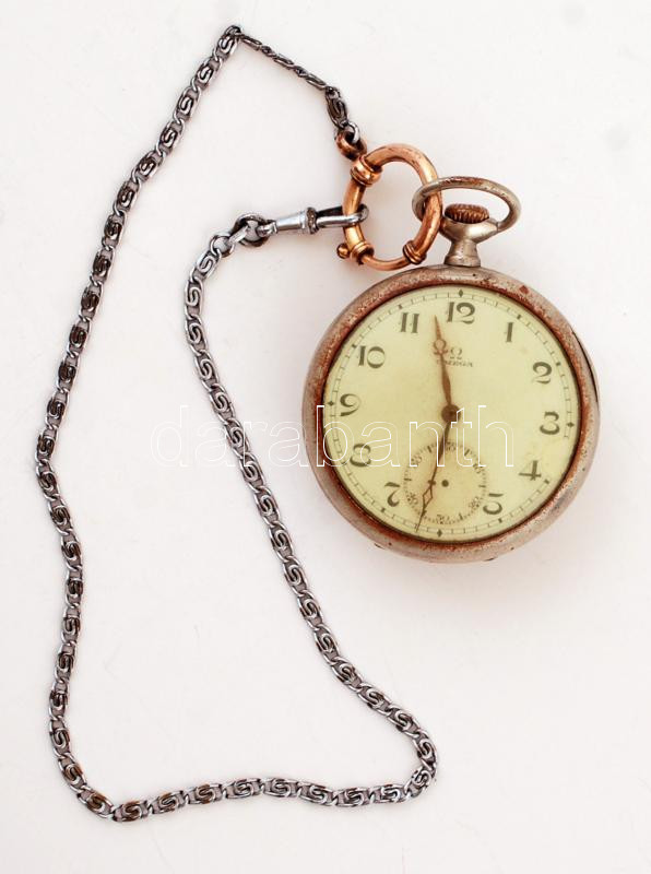 Beschreibung: Omega márkájú zsebóra, lánccal, másodpercmutató nélkül, nem működik