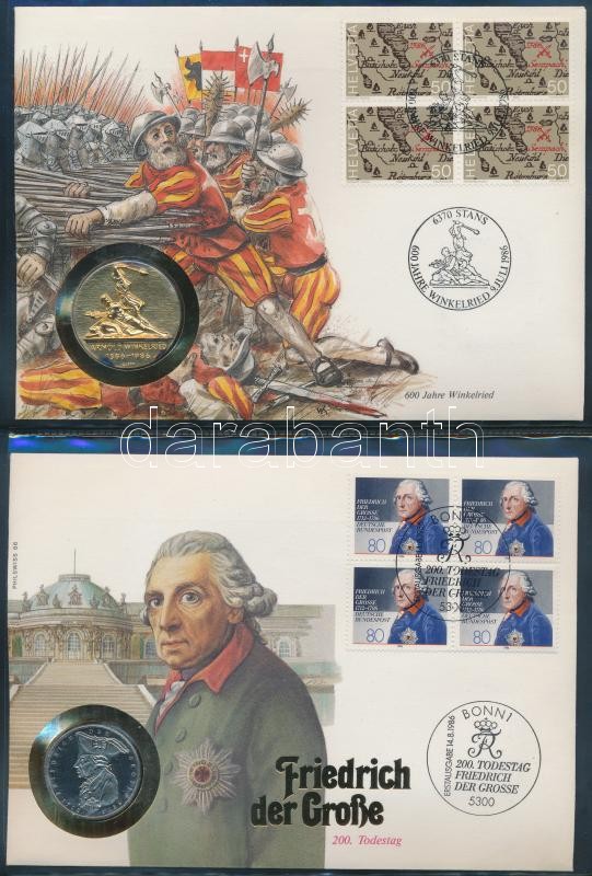 38db-os érmés és bankjegyes boríték bélyeggel és bélyegzéssel, szép gyűjtemény svájci gyűjtői albumba rendezve T:1,I