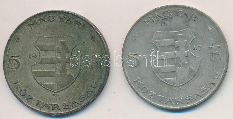 1947. 5Ft Ag "Kossuth" (2x) T:2-,3 patina https://www.darabanth.com/de/243-Fernauktion/243.0/Numismatik/Ungarische-Munzen~8/1947-5Ft-Ag-Kossuth-2x-T2-3-patina~II1145733