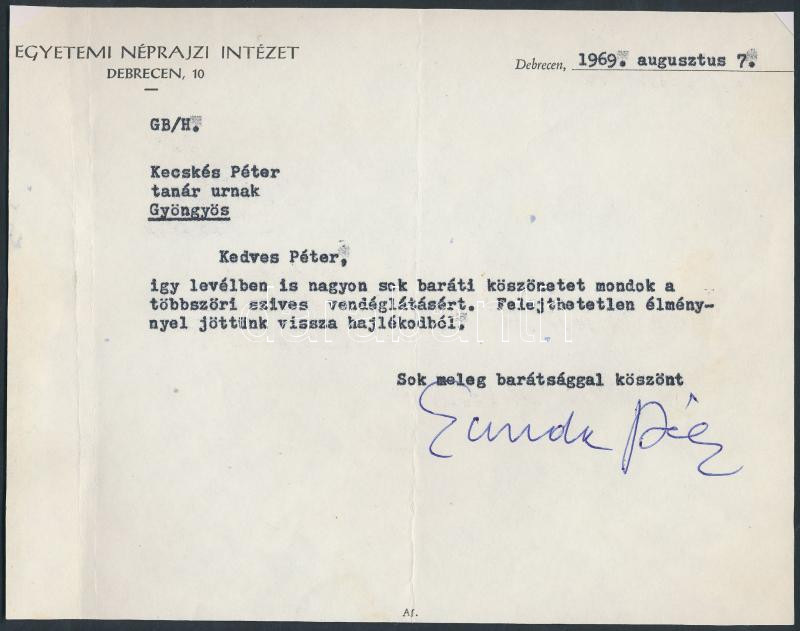 Beschreibung: 1969 dr. Gunda Béla Herder díjas etnográfus egyetemi professzor levelének saját kezű aláírása, 14x18cm