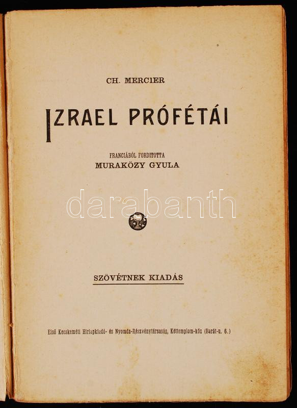 Mercier, Ch: Izrael prófétái. Francziából fordította: Muraközy Gyula. ... https://www.darabanth.com/de/245-Fernauktion/245.0/Andere-Sammelgebiete/Bucher-Judaica~600047/Mercier-Ch-Izrael-profetai-Francziabol-forditotta-Murakozy-Gyula-Bp-1926-Szovetnek-~II908318