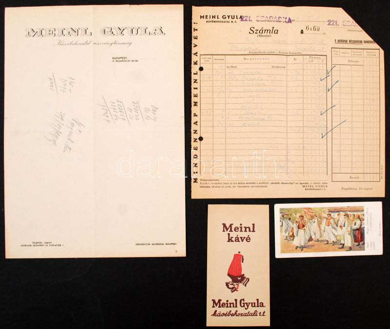 Beschreibung: A Meinl Gyula Kávébehozatali Részvénytársaság fejléces levélpapírja, számlája, szórólapja és számolócédulája