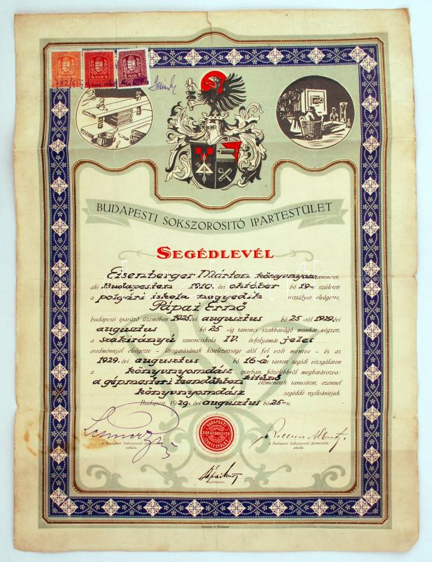 1929 Könyvnyomdász Segédlevél, Budapesti Sokszorosító Ipartestület seg... https://www.darabanth.com/de/246-Fernauktion/246.0/Andere-Sammelgebiete/Drucksachen~1400003/1929-Konyvnyomdasz-Segedlevel-Budapesti-Sokszorosito-Ipartestulet-segedlevele-kisse-visel~II1171298