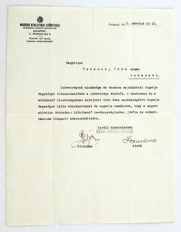 1935 Magyar Athletikai Szövetség levele fejléces papíron az elnök és a... https://www.darabanth.com/de/246-Fernauktion/246.0/Andere-Sammelgebiete/Drucksachen~1400003/1935-Magyar-Athletikai-Szovetseg-levele-fejleces-papiron-az-elnok-es-a-fotitkar-alairasa~II1171766