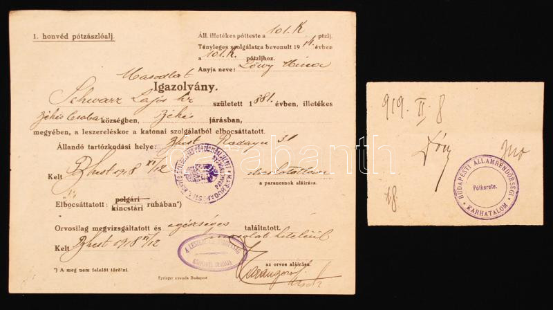 1918 1. honvéd pótzászlóalj katonai szolgálatból elbocsájttatott, 17x2... https://www.darabanth.com/de/246-Fernauktion/246.0/Andere-Sammelgebiete/Militaria~1400001/1918-1-honved-potzaszloalj-katonai-szolgalatbol-elbocsajttatott-17x21cmplus-betetlap-Budapest~II1170251