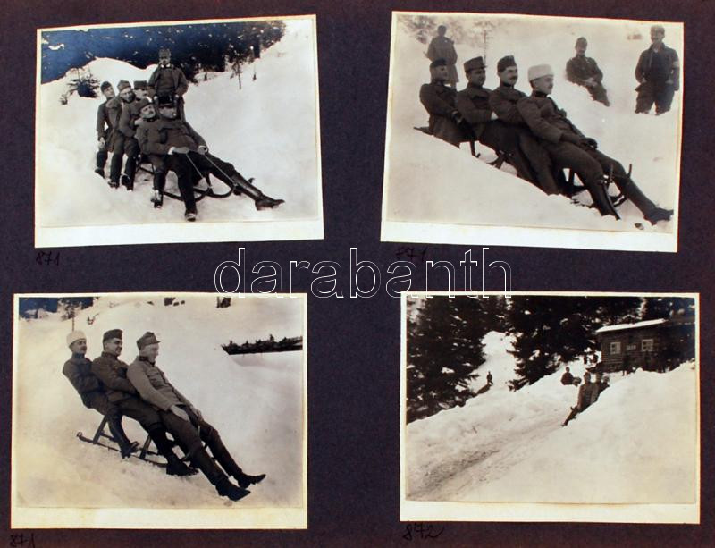 Beschreibung: cca 1914-1918 Katonák élvezik a havat, 7 db fotó albumlapra ragasztva, 11x8 cm /