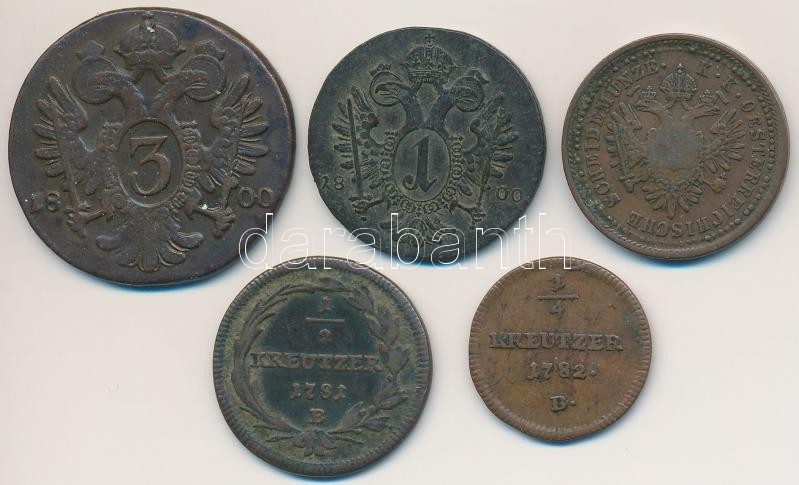 1781B 1/2kr Cu + 1782B 1/4kr Cu + 1851G 1Kr Cu + 1800A 1kr Cu + 1800S ... https://www.darabanth.com/de/246-Fernauktion/246.0/Numismatik/Ungarische-Munzen~400009/1781B-12kr-Cu-plus-1782B-14kr-Cu-plus-1851G-1Kr-Cu-plus-1800A-1kr-Cu-plus-1800S-3kr-Cu-T2-3~II1170469