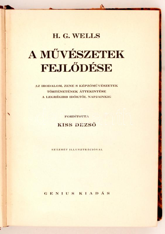 Wells, H. G.: A művészetek fejlődése. Az irodalom, zene s képzőművészetek történetének áttekintése a legrégibb időktől napjainkig. Ford. Kiss Dezső. Százhét illusztrációval. Bp., é.n., Genius. Kiadói, aranyozott gerincű, félbőr kötésben, kissé kopottas