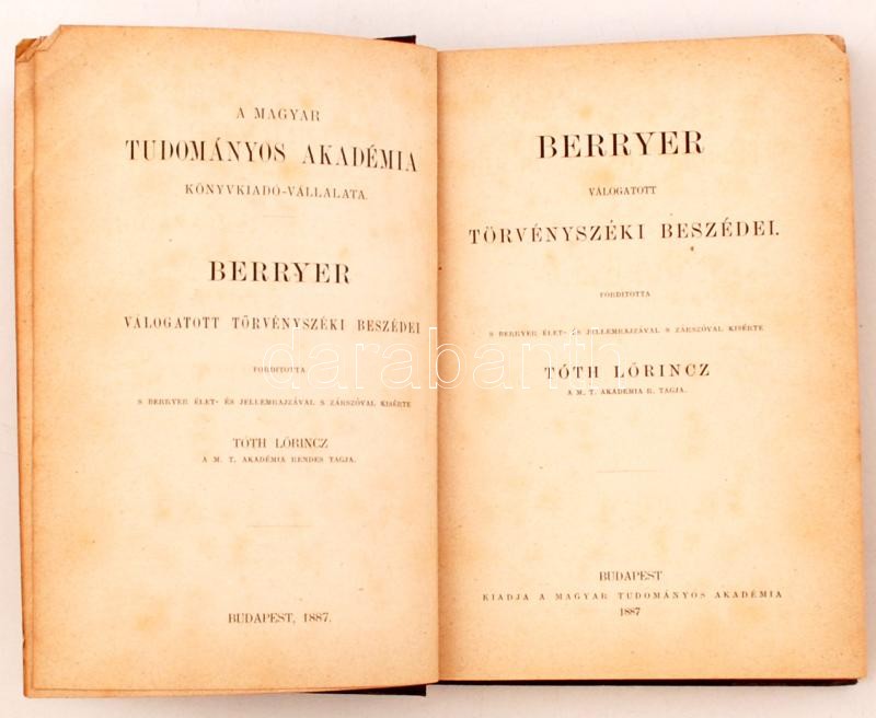 Berryer válogatott törvényszéki beszédei. Fordította Tóth Lőrinc, Bp., 1887, Magyar Tudományos Akadémia. Kiadói egészvászon kötés, kissé kopott állapotban.