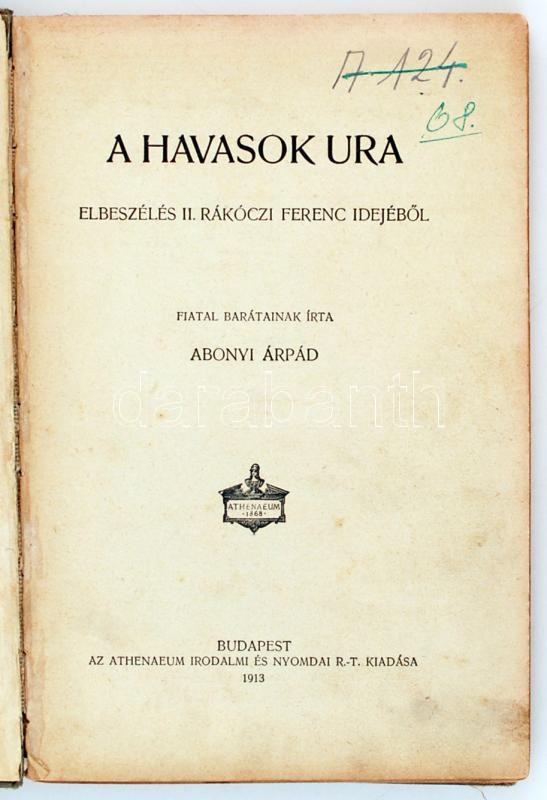 Abonyi Árpád: A havasok ura. Elbeszélések II. Rákóczi Ferenc idejéből.... https://www.darabanth.com/de/247-Fernauktion/247.0/Andere-Sammelgebiete/Bucher-Sonstige-Raritaten~1000040/Abonyi-Arpad-A-havasok-ura-Elbeszelesek-II-Rakoczi-Ferenc-idejebol-Bp-1913-Athenaeum~II1139175
