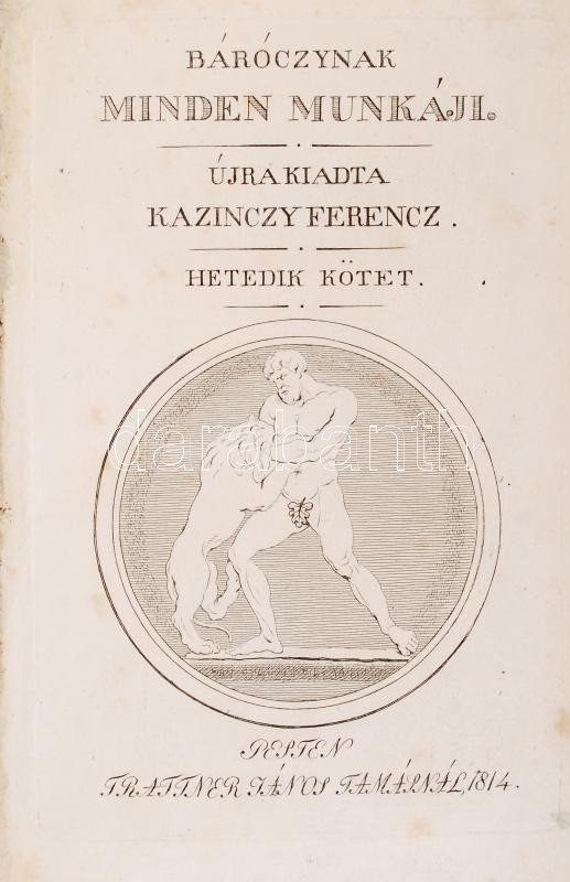 Báróczynak minden munkáji. Újrakiadta Kazincy Ferencz. Hetedik kötet. Pesten, 1814, Trattner János. Félbőr kötésben, gerincnél aranyozott. Gerincnél egy szakasz szakadt. A lapok kissé foltosak, egyébként jó állapotú. Tulajdonosi aláírással.
