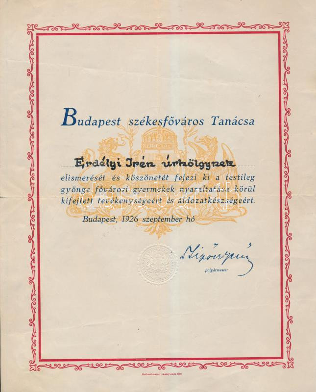 1926 Bp., Budapest Székesfőváros Tanácsa által kiállított oklevél gyer... https://www.darabanth.com/de/247-Fernauktion/247.0/Andere-Sammelgebiete/Dokument~1000015/1926-Bp-Budapest-Szekesfovaros-Tanacsa-altal-kiallitott-oklevel-gyermekek-nyaraltatasava~II1175471