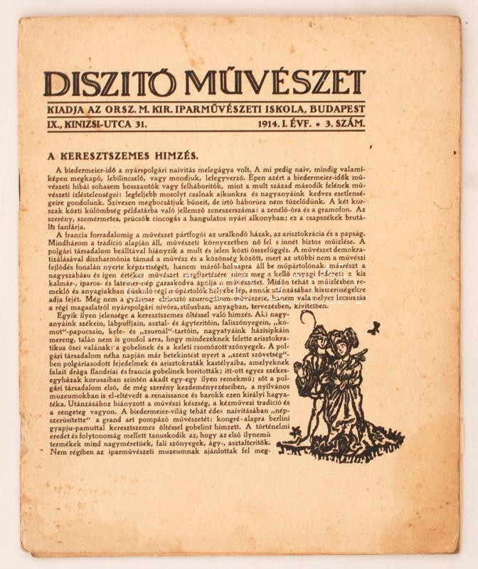 1914 Díszítő Művészet. 1914.I. évf. 3. szám. Kiadja az Orsz. M. Kir. Iparművészeti Iskola, Budapest. A szám nagy része a linometszés technikáját mutatja be gazdagon illusztrálva több nagy művész metszettével. Egy lap kijár.