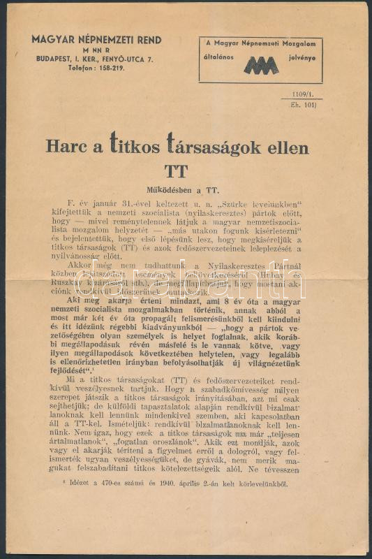 Beschreibung: 1942 "Harc a Titkos Társaságok ellen", a Magyar Népnemzeti Rend szélsőjobboldali mozgalom szórólapja, 4 p.