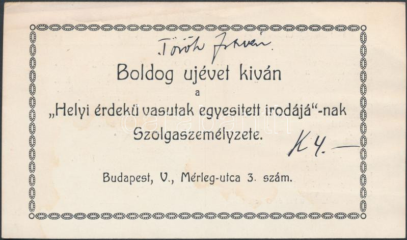 cca 1910 A Helyi Érdekű Vasútak egyesített irodájának üdvözlő kártyája https://www.darabanth.com/de/247-Fernauktion/247.0/Andere-Sammelgebiete/Drucksachen~1000027/cca-1910-A-Helyi-Erdeku-Vasutak-egyesitett-irodajanak-udvozlo-kartyaja~II1084432