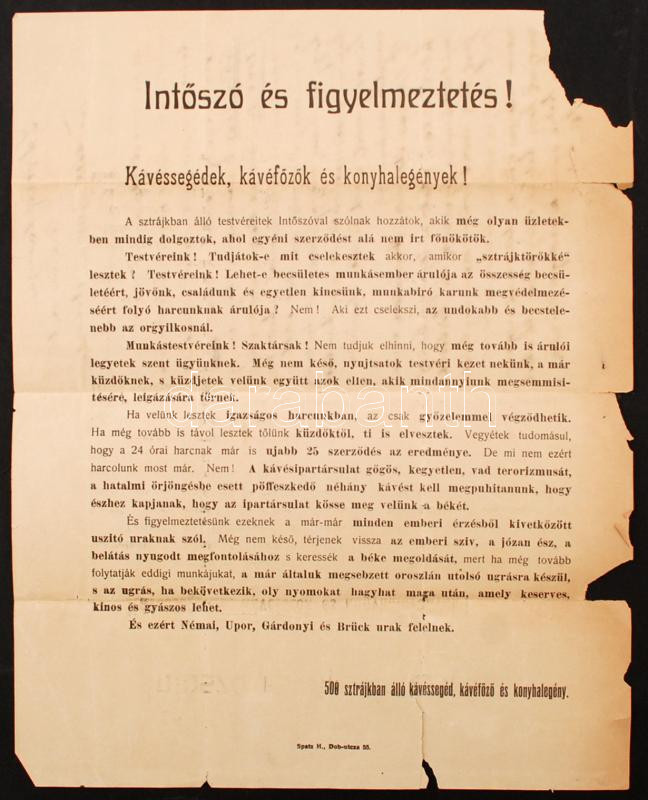 cca 1920-30 Kávéházi munkásokhoz szóló intőszó és figyelmeztetés, röpl... https://www.darabanth.com/de/247-Fernauktion/247.0/Andere-Sammelgebiete/Drucksachen~1000027/cca-1920-30-Kavehazi-munkasokhoz-szolo-intoszo-es-figyelmeztetes-roplap-papir-viselte~II1176742