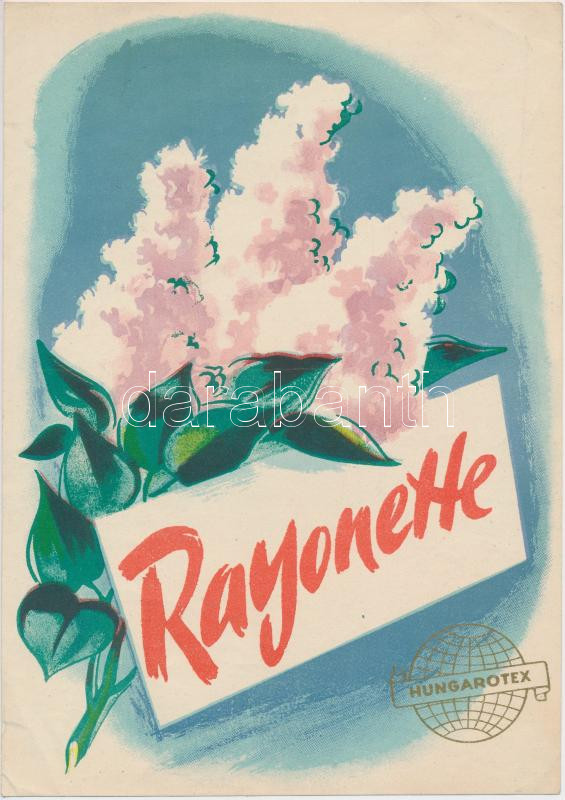 cca 1960 Rayonette Hungarotex az egyik legrégebbi magyar külkereskede... https://www.darabanth.com/de/247-Fernauktion/247.0/Andere-Sammelgebiete/Drucksachen~1000027/cca-1960-Rayonette-Hungarotex-az-egyik-legregebbi-magyar-kulkereskedelmi-vallalat-reklam-plaka~II1131000