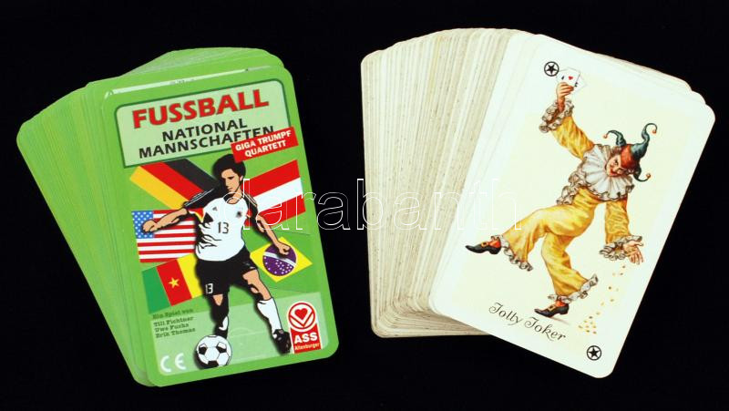 Beschreibung: 1 pakli francia kártya (55 lap), történelmi személyekkel + 1 pakli német nyelvű focis kártya