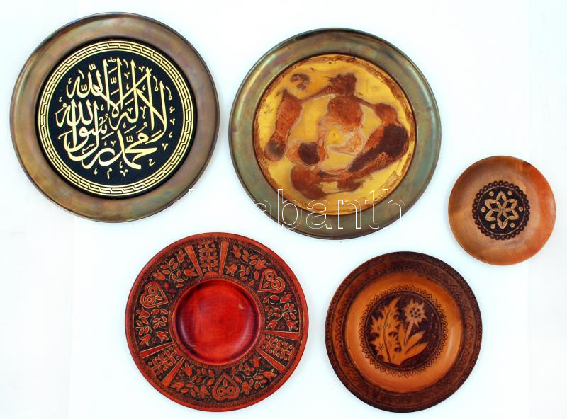 Beschreibung: 2 db dekoratív réz fali tál, 3 db fából készült fali tál