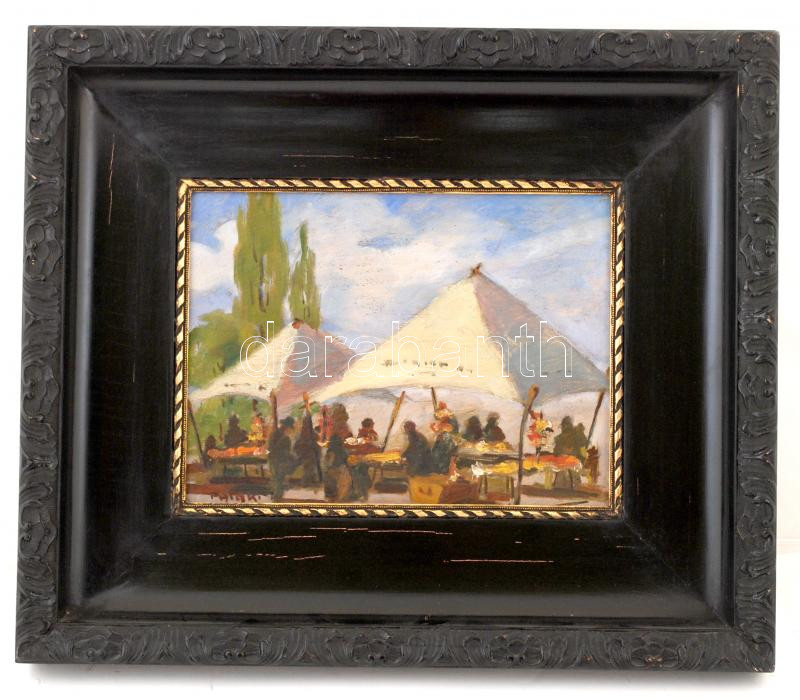 Beschreibung: Pataki jelzéssel: Vásári jelenet. Olaj, karton, antik keretben, 27×34 cm