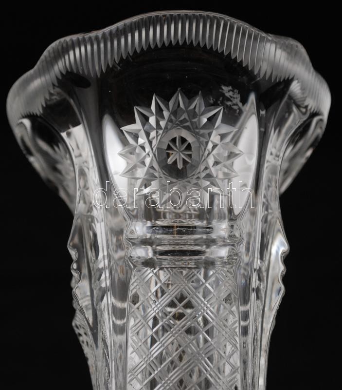 Dekoratív csiszolt üveg váza fém talppal, hibátlan, m:23 cm https://www.darabanth.com/de/247-Fernauktion/247.0/Andere-Sammelgebiete/Glaser~1000007/Dekorativ-csiszolt-uveg-vaza-fem-talppal-hibatlan-m23-cm~II1162997