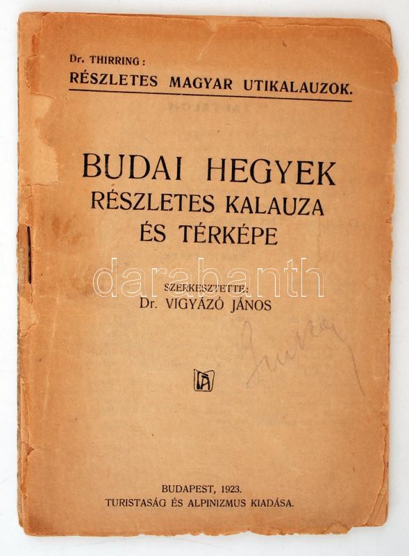 1927 A Budai hegyek térképe, kiadja a magy. kir. állami térképészet, vászontérkép, 69x49 cm, hozzá Dr. Vigyázó János: Budai hegyek részletes kalauza és térképe. Bp., 1923, Turistaság és Alpinizmus. Kiadói papírkötés, kopottas állapotban.