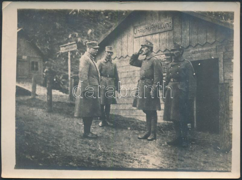 1915-18 "Raffay gyógyszerész jelentkezik of. Salvator főhercegnél a 72. Sanitats kolonne inspicirungja alkalmából" katonai fotó,verzón feliratozva, 9x14cm/ Military photo from I. war