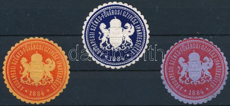 Beschreibung: 1884 Budapest Főváros Cipész Ipartestület 3 db klf pecsétbélyeg
