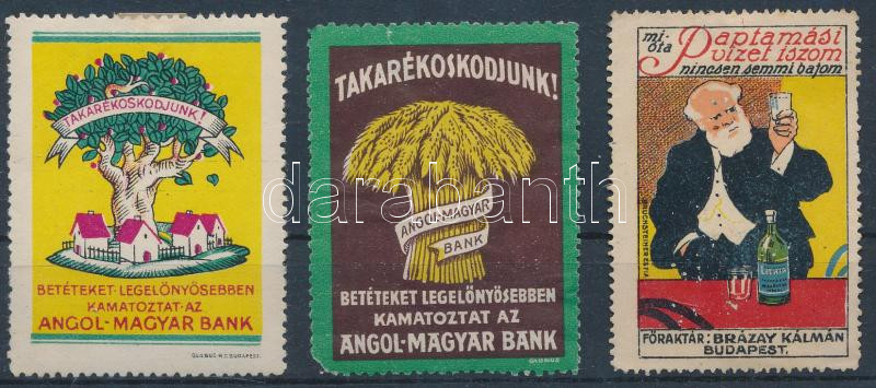 1930 Angol-magyar bank és Paptamási víz 3 db reklámbélyeg https://www.darabanth.com/de/247-Fernauktion/247.0/Andere-Sammelgebiete/Paraphilatelie~1000013/1930-Angol-magyar-bank-es-Paptamasi-viz-3-db-reklambelyeg~II1177779