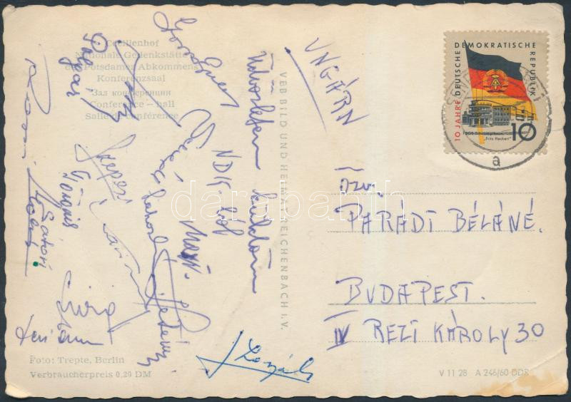 Beschreibung: 1962 Az Újpesti Dózsa labdarúgó csapat tagjainak saját kezű aláírásával hazaküldött lap, rajta Grosics Gyula aláírásával