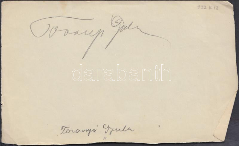 Aláírása kivágáson. https://www.darabanth.com/de/247-Fernauktion/247.0/Andere-Sammelgebiete/Signatur~1000017/Toronyi-Gyula-1896-1966-tenor-3Cbr3EAlairasa-kivagason~II1009920
