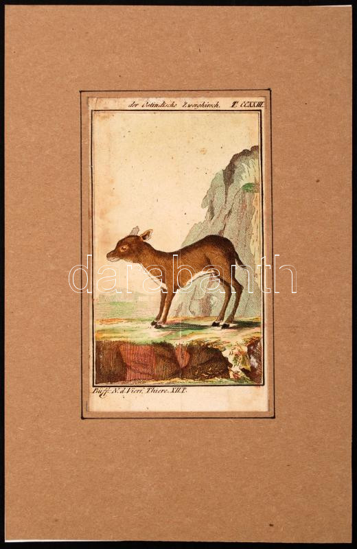 1784-1785 "Zwerghirsch", rézmetszet, papír, George-Louis Leclerq de Buffon (1707-1788) francia természettudós Allgemeine Naturgeschichte című művéből (Berlin, 1771), 12,5×8 cm / Etching from the book Allgemeine Naturgeschichte