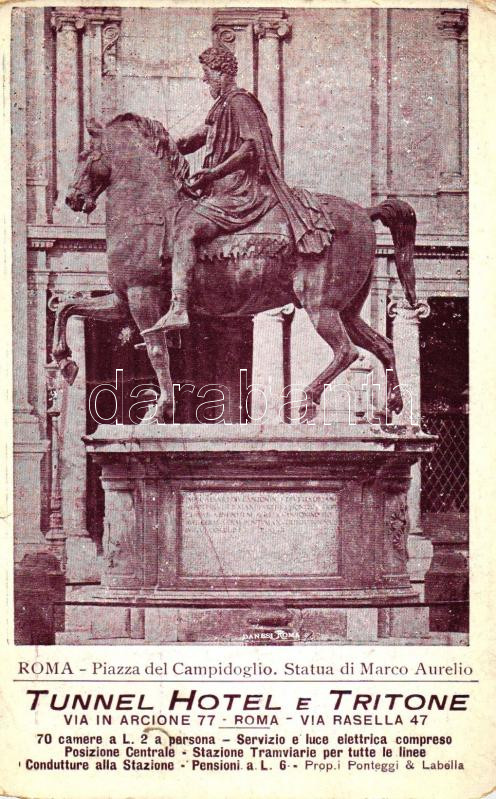 Beschreibung: Rome, Roma; Piazza del Campidoglio, Statua di Marco Aurelio, Tunnel Hotel e Tritone / hotel advertisement (b)