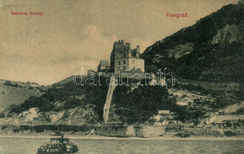 Visegrád, Salamon torony, gőzhajó; Divald Károly (vágott / cut) https://www.darabanth.com/de/247-Fernauktion/247.0/Ansichtskarten/Ungarn~8/Visegrad-Salamon-torony-gozhajo-Divald-Karoly-vagott-cut~II1051771