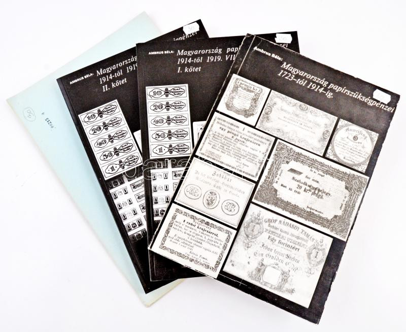 Tálas Géza: Magyarország rendjelei és kitüntetései 1922-1944. Budapest, Magyar Éremgyűjtők Egyesülete, 1975. + Ambrus Béla: Magyarország papírszükségpénzei 1723-tól 1914-ig. Budapest, Magyar Éremgyűjtők Egyesülete, 1977. + Ambrus Béla: Magyarország papírszükségpénzei 1914-től 1919. VIII. 1-ig. I-II. kötet. Budapest, Magyar Éremgyűjtők Egyesülete, 1986. mind használt állapotban