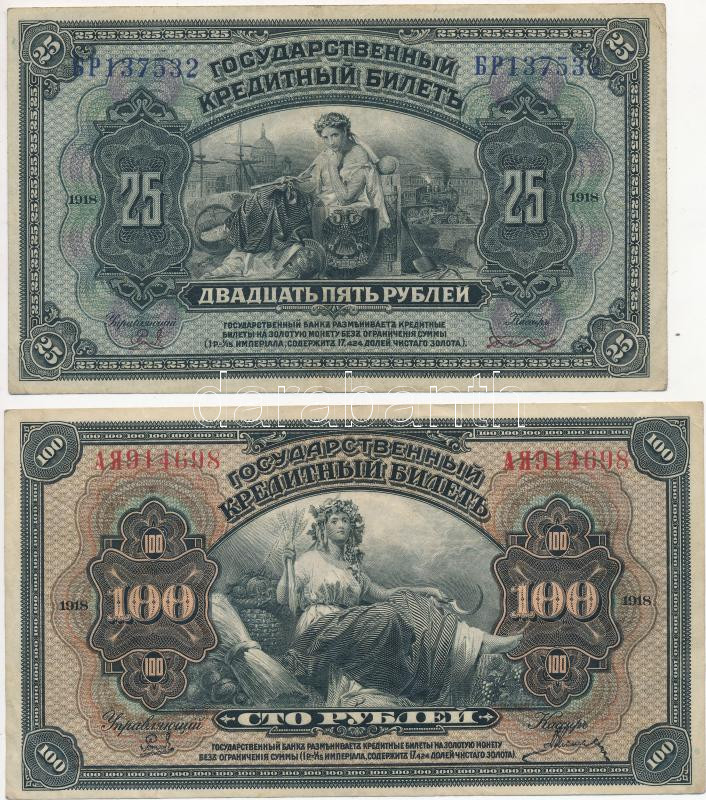 Russian E... https://www.darabanth.com/de/248-Fernauktion/248.0/Numismatik/Weltweit-Banknoten~400011/Orosz-Birodalom-1918-25R-plus-100R-mindketto-alairassal-TIII--Russian-Empire-1918-25-Rubles-plus-10~II1187738