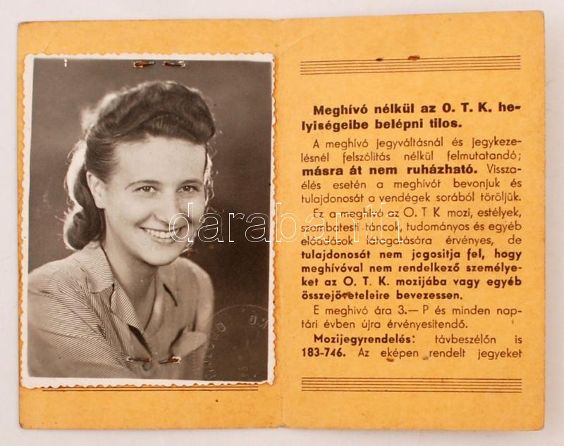 Beschreibung: 1944 Országos Tiszti Kaszinó meghívója hölgy részére, fényképes igazolvány okmánybélyeggel (5pengő) 10x6cm