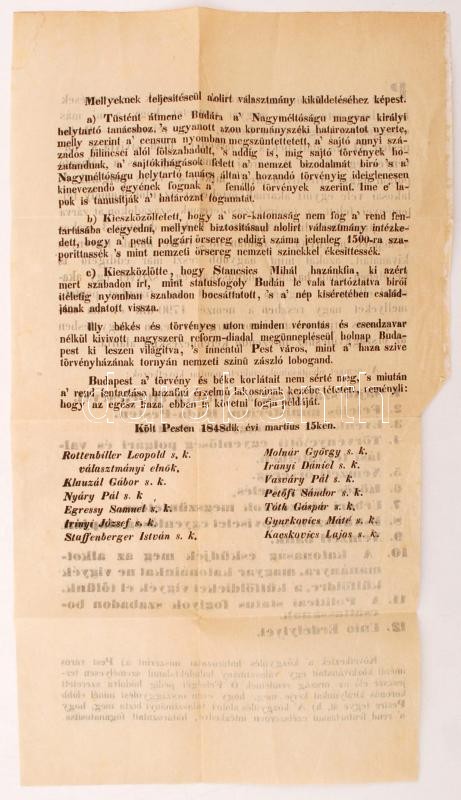 Beschreibung: 1848 A Közcsendi Választmány tagjainak nyomtatott hirdetménye a március 15-i eseményekről és azok sikeréről, benne a 12 pont felsorolásával, 2 p.