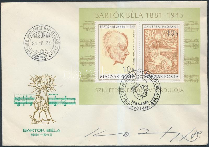 Beschreibung: 1981 Bartók Béla FDC Kass János bélyegtervező grafikusművész aláírásával