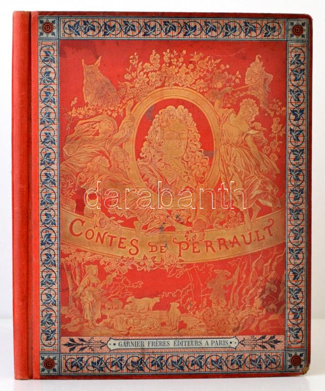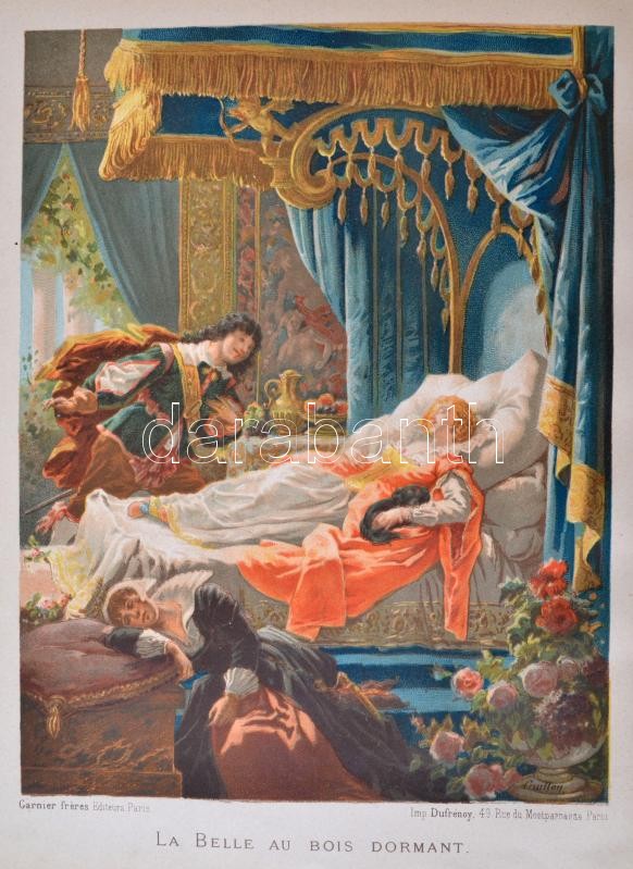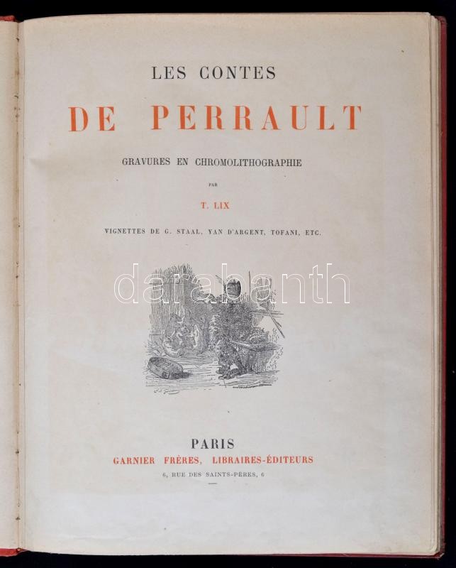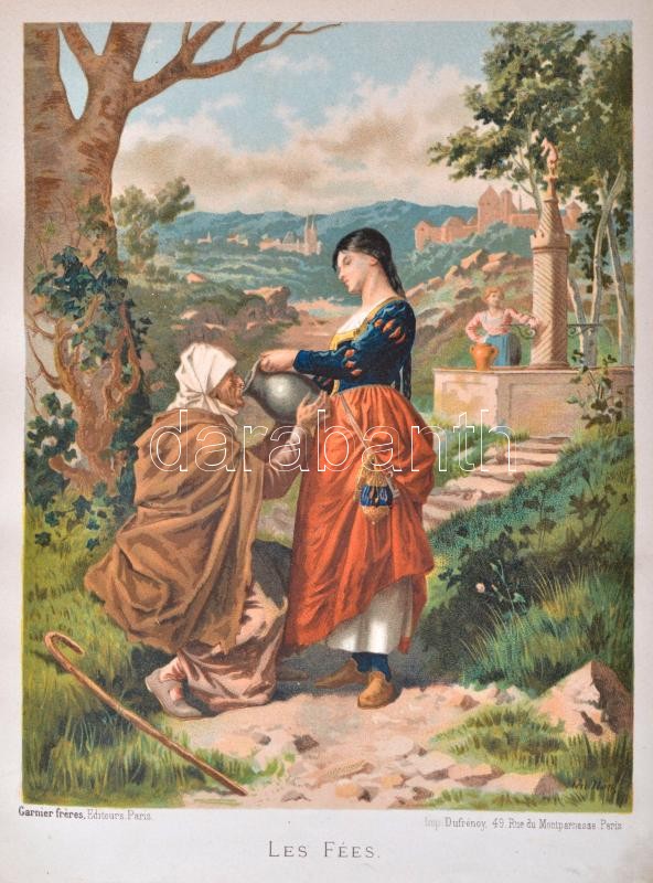 Charles Perrault: Les Contes De Perrault. Gravures en chromolitographie par T. Lix. Vignettes De G. Staal, Yan D'Argent, Tofani, etc. Paris, é.n. (XIX. század vége), Garnier Fréres Éditeurs, 81 p. + 7 egészoldalas kromolitográfiával. Kiadói aranyozott, egészvászon kötés, aranyozott lapélekkel. Charles Perrault meséi, francia nyelvű. / Tales of Charles Perrault, in french language, from the end of the 19th century, with seven chromolitographies. Cloth-binding.