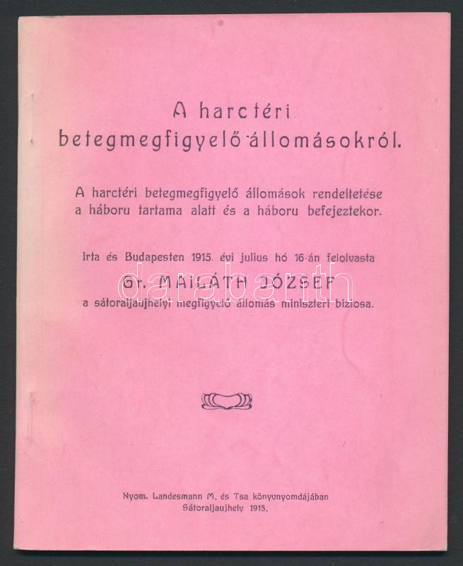 A harctéri betegmegfigyelő állomások rendeltetése a háboru tartama alatt és a háboru befejeztekor. Sátoraljaújhely, 1915. (Landesmann M. és Tsa ny.) 62 l. 1 lev. Fűzve, kiadói borítékban.Jó állapotban.