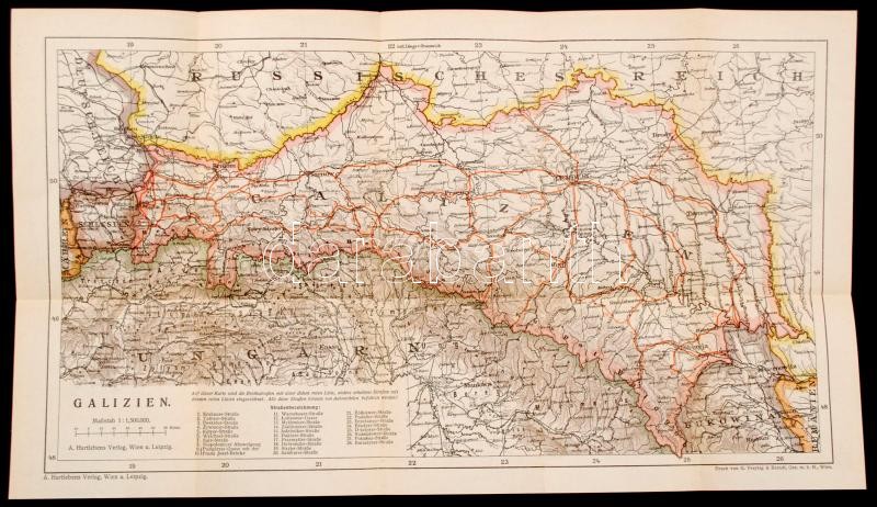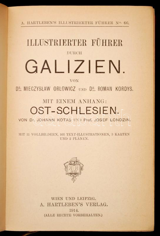 Dr. Mieczyslaw Orlowicz - Dr. Roman Kordys: Illustrierter Führer durch Galizien. Mit einem anghang: Dr. Johann Kotas - Prof. Josef Londzin: Ost-Schlesien. Wien-Leipzig, 1914, A. Hartleben's Verlag, XVI+388 p. Kiadói aranyozott egészvászon kiadás. Térképekkel és képekkel illusztrálva, festett lapélekkel. Német nyelven. A borítója kicsit kopottas. / Cloth binding, in german language. The cover is little bit worn.