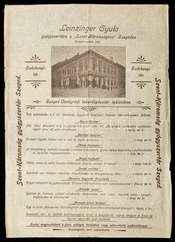 cca 1910 Lenzinger Gyula szegedi Szentháromság gyógyszertára reklámnyo... https://www.darabanth.com/de/25-Gross-Auktion/25.1/Kunst-Dokumente/Drucksachen~9787/cca-1910-Lenzinger-Gyula-szegedi-Szentharomsag-gyogyszertara-reklamnyomtatvanya~II1370107