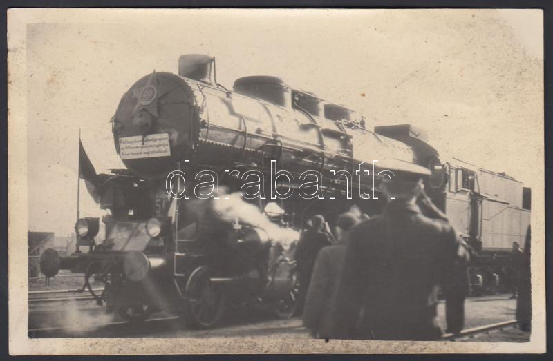 cca 1950 Szeged, the locomotive of the Hungarian Stakhanovite movement arrives to the railway station, with notes on the backside,9×14 cm