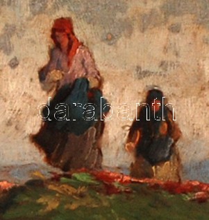 Beschreibung: Rákosi Uitz János (1887-?): Parasztasszonyok. Olaj, karton, jelzett, keretben, 23×34 cm