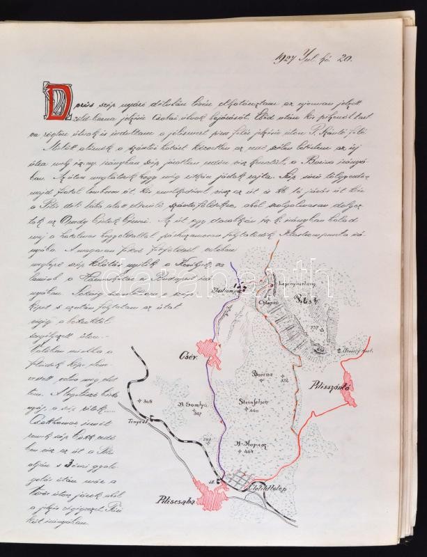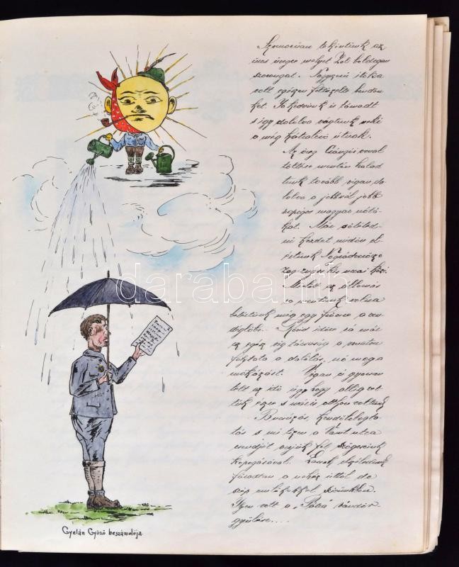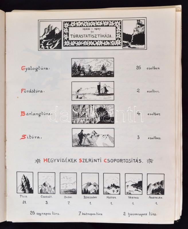 1927 Egy szenvedélyes turista és barlangász képes naplója. Magyarországi barangolások részletes leírása rajzokkal és fényképekkel illusztrálva 130 oldalon. Számos jól sikerült és humoros rajz, szép iniciálék, begarasztott fotók és képeslapok. / Drawn diary of wanderings in Hungary