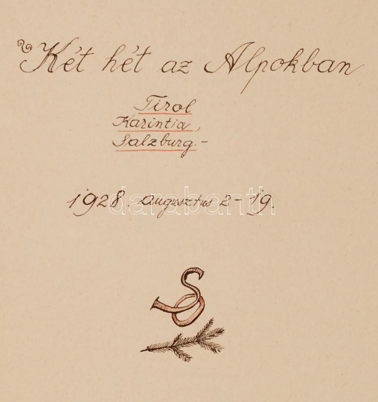 Skolil Ottó (1905-1945): Két hét az Alpokban.Tirol-Karintia - Salzburg 1928. augusztus 2-19. Skolil Ottó kézzel Ãrt, rajzolt és fekete-fehér fotókkal illusztrált naplója az 1928-as Alpok túrájáról. (A túrát BÃró Pállal tette meg.) Szénássy Béla gyártotta füzet borÃtójában, 1+42 l. + 13 t. A borÃtó szakadt.