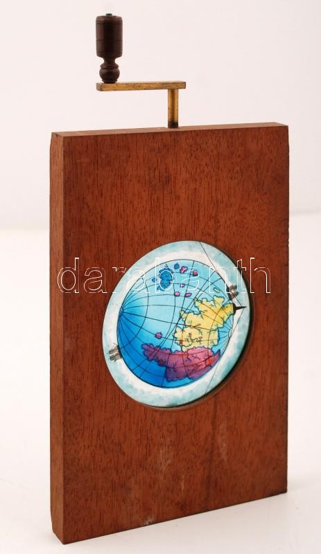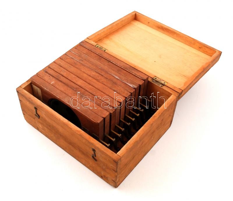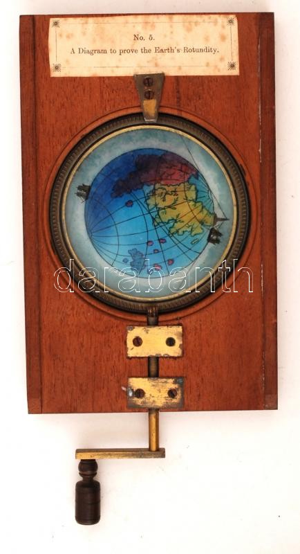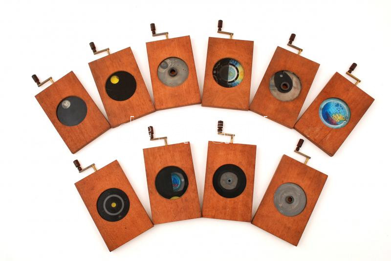 cca 1900 viktoriánus Laterna magica diák, 10 darab, angol felirattal, kopottas fadobozban, diák: No. 1. - The Solar System, shewing the Revolution of all the Planets with their Satellites round the Sun. No. 2. - The Earth's Annual motion round the Sun, shewing the paralellism of its axis, producing the Seasons. No. 3. - This Diagram illustrates the cause of Spring and Neap tides and shews the Moon's Phases during revolution. No. 4. - This Diagram illustrates the apparent direct and retrograde motion of Venus or Mercury; and also its stationary appearance. No. 5. - A Diagram to prove the Earth's Rotundity. No. 6. - This Diagram illustrates the eccentric Revolution of a Comet round the Sun, and shews the appearence of its Tail at different points of its Orbit. No. 7. - The Diurnal Motion of the Earth, shewing the Rising and Setting of the Sun, illustrating the cause of day and night. No. 8. - This Diagram illustrates the Annual Motion of the Earth round the Sun, with the Monthly lunations of the Moon. No. 9. - This Diagram shews the various Eclipses of the Sun with the transit of Venus. No. 10.- This Diagram shows the various Eclipses of the Moon., diák fa része néhol kopottas, kettő üvege megrepedt (N. 8.,9.) , egy dia javításra szorul (No.6.),egynél a szöveget ceruzával áthúzták és átírták (No. 10.), faboz: 20x25x13 cm, diák: 11x23 cm. / cca 1900 Victorian Magic Lantern (or Laterna Magica) Slides, ten pieces, with english writings, worn wood box in it, the wood part of the slides are little bit worn, two slide of glass cracked, one slide needs repair, one slide of writins crosses, and rewrites with pencil, woodbox: 20x25x13 cm, slides: 11x23 cm.