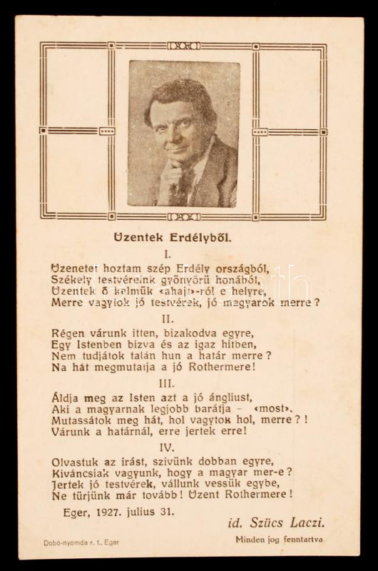 1927 Szűcs Laczi (1898-1990) Romániából kitiltott színész, operaénekes aktuálpolitikai utalásokat tartalmazó "Üzenetek Erdélyből" című dala fényképes fotólapon, hátlapján a művész aláírásával