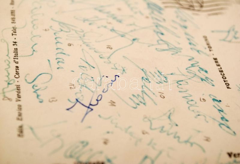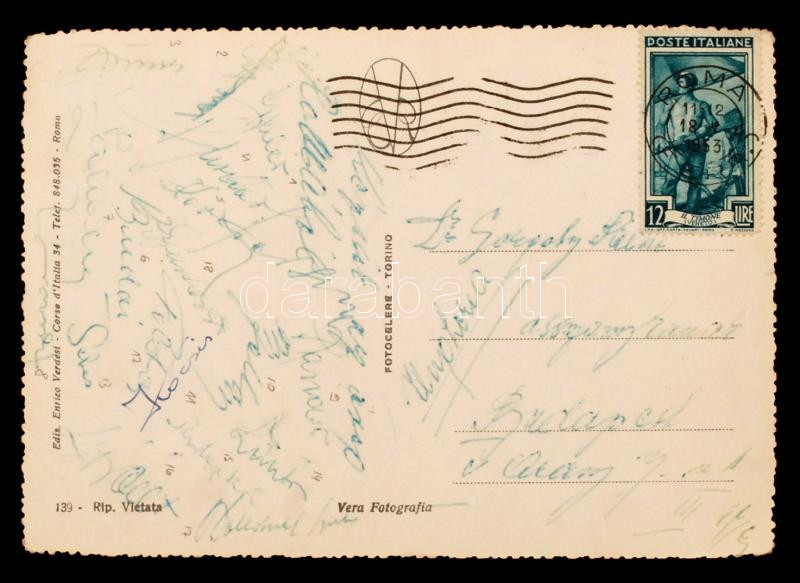 1953 Az Aranycsapat tagjai (köztük Gellér, Grosics, Börszsei, Puskás, Kovács, Budai, stb. összesen 18) által aláírt képeslap Rómából (Olasz-magyar 0:3) Czibor Zoltán anyósának, 10x15cm